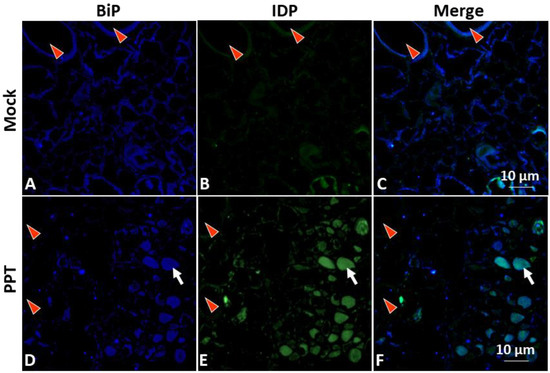 Confocal microscopy for visualization of the immunostained ER luminal binding immunoglobulin protein (BiP, an ER-resident protein) and potato purple top (PPT) phytoplasmas in tomato plants. The figure provides critical visual evidence of the cellular interactions between BiP and PPT phytoplasmas in tomato plants. (A–C) mock control plants; (D–F) PPT-phytoplasma-infected tomato plants. Immunostaining was performed using an anti-BiP antibody and a secondary antibody conjugated with Alexa Fluor™488 (Blue) to visualize the BiP protein expression in mock control (A) and PPT-phytoplasma-infected tomato plants (D). The distribution and colonization of PPT phytoplasmas were observed in mock control (B) and infected (E) plants. Immunostaining was conducted with an anti-immunodominant membrane protein (IDP) antibody and secondary antibody conjugated with Alexa Fluor™ 405 (green). (C,F) are the merged images of (A) and (B), and (D) and (E), respectively. Red triangles indicate the xylem tissues. White arrows indicate the large, aggregated structures. Scale bar = 10 µm.
