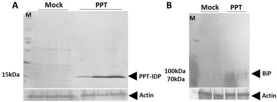Western blot analysis results. Confirmation of the specificity of the antibody and investigation of the expression of the host protein in the tomato plants infected with potato purple top (PPT) phytoplasma. (A) Validation of the specificity of a polyclonal antibody raised against the purified immunodominant protein (IDP) of PPT phytoplasma. The total proteins were extracted from the leaves of tomato plants infected with PPT phytoplasma and mock control plants, and an anti-PPT-IDP antibody was used and confirmed its specificity in detecting IDP. (B) Determination of the expression of binding immunoglobulin protein (BiP) in PPT-phytoplasma-infected tomato plants. Actin antibody was used as the loading control. M: marker (PageRuler™ Plus Prestained Protein Ladder, 10 to 250 kDa).