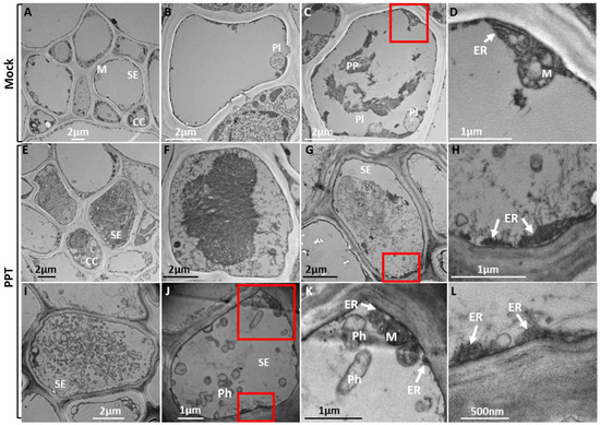 Transmission electron microscopy for visualization of morphological changes in the ultrastructure of endoplasmic reticulum (ER) organelle induced by potato purple top (PPT) phytoplasmas in tomato plants. (A–D) Mock control plants. (D) The close-up image of the red box of (C). (E–L) PPT-phytoplasma-infected tomato plants. (H) The close-up image of the red box of (G). (K,L) are close-up images of the upper and lower red boxes in (J). M: Mitochondria; PP: Phloem proteins; SE: sieve element; CC: companion cell; ER: endoplasmic reticulum; Ph: phytoplasma; Pl: plastid.