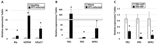 Gene expression analysis by quantitative real-time PCR (qRT-PCR) in tomato plants and BiP gene-silencing tomato line infected with potato purple top (PPT) phytoplasma. (A) Expression of UPR marker genes, BiP, bZIP60, and bZIP17, in PPT-infected tomato plants. (B) Expression of salicylic acid resistance marker genes, PR1, PR5, and NPR1, in PPT-phytoplasma-infected plants. (C): Expression of SA resistance marker genes, PR1, PR5, and NPR1, in PPT-phytoplasma-infected TRV-BiP tomato plants. Asterisk (*) indicates significantly different by Student’s t test (p < 0.05).