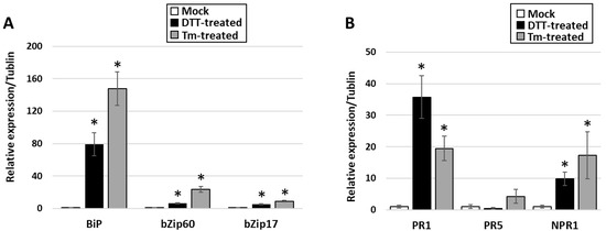 Gene expression analysis by quantitative real-time PCR (qRT-PCR) in potato purple top (PPT)-phytoplasma-infected plants treated with UPR chemical inducers (Tm and DTT). The figure provides information on the effects of UPR chemical inducers on the expression of specific genes related to the UPR and salicylic acid (SA) resistance pathways. (A) UPR marker genes, BiP, bZIP60, and bZIP17. (B) SA resistance marker genes, PR1, PR5, and NPR1. Asterisk (*) indicates significantly different by Student’s t test (p < 0.05).