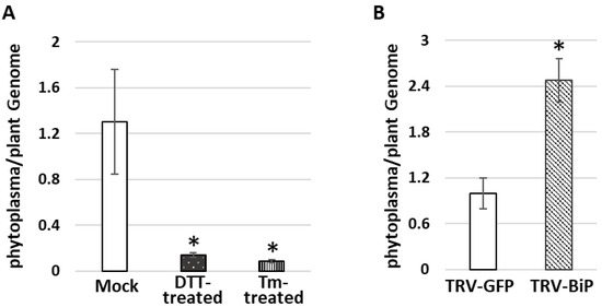 Measurement of phytoplasma titer in different tomato plants infected with potato purple top (PPT) phytoplasma. The figure provides important data on phytoplasma titer changes in different experimental conditions. (A) PPT phytoplasma titer in PPT-infected tomato plants treated with UPR chemical inducers DTT and Tm. (B) PPT phytoplasma titer in BiP gene-silencing tomato line (TRV-BiP), which was generated by using a tobacco rattle virus (TRV) vector. TRV-GFP tomato line was used as a control. Asterisk (*) indicates significantly different by Student’s t test (p < 0.05).