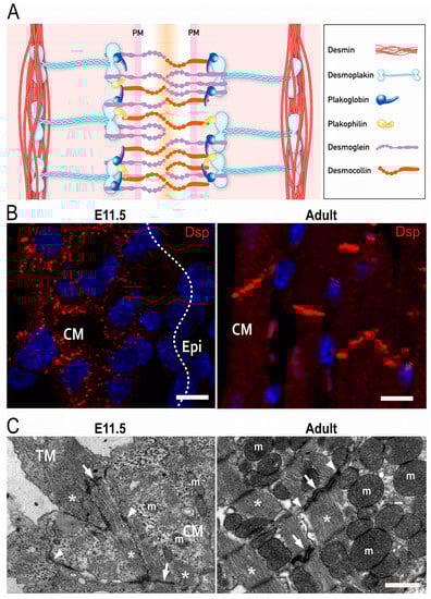 Desmosomes are specialized structures, which support the physical stability and integrity of epithelial and heart tissue. Cardiac desmosomes are formed by clustering of the Ca2+-dependent adhesion molecules (cadherins) desmoglein 2 (Dsg2) and desmocollin 2 (Dsc2) in the plasma membrane. They interact with each other via their extracellular domains to link neighboring cells. Intracellularly, the clustered desmosomal cadherins are connected to plakophilin 2 (Pkp2) and plakoglobin (PG), both of which contain multiple copies of the 42 amino acid-long armadillo repeat. They serve not only as structural linkers in desmosomes but fulfill additional cellular functions impacting adherens junctions, cytoskeletal organization, and gene transcription. The functions of the large cytolinker desmoplakin (Dsp), on the other hand, are much more restricted to desmosomes. Dsp is essential for the linkage between the clustered desmosomal cadherins with their associated armadillo-repeat proteins and the intermediate filament cytoskeleton, which consists of desmin polypeptides in cardiomyocytes (Figure 1A) [,]. Although the molecular composition of desmosomes is the same in the embryonic and adult heart, the arrangement of desmosomes differs. A distinctive characteristic of mammalian adult cardiomyocytes is their maturation process, which is initiated postnatally. Round-shaped embryonic cardiomyocytes initially form independent adherens junctions and desmosomes with neighboring cells throughout their entire borders. Concurrent with myofibril elongation and organization, desmosomes and adherens junctions concentrate at the apical surfaces of cardiomyocytes where they serve important mechanical functions []. Postnatally, the junctions amalgamate forming hybrid junctions that are composed of tightly integrated desmosomes and adherens junctions, which are in close apposition to gap junctions and membrane channels. This supercomplex has been referred to as area composita and connexome [,]. It was suggested that the maturation phase is essential to ensure life-long contraction of cardiomyocytes [,].