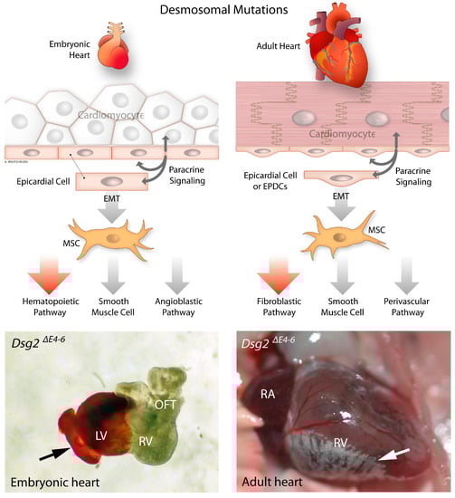During the last decades, research in the AC field was dominated by investigating the role of desmosomal proteins in adult cardiomyocytes [,]. It, however, remains to be explored whether desmosomal deficiency triggers “primary events” for the renewal or differentiation of cardiac progenitors both in the developing and mature heart. Of note, molecular pathways that are activated during embryonic development can be reactivated in pathological conditions []. This review focuses on the role of desmosomal proteins in cardial and epicardial morphogenesis. We begin with an overview of desmosomal proteins and structural differences between embryonic and adult hearts. This is followed by describing the development of cardiac progenitors and the formation of junctions in embryonic hearts. We further summarize current knowledge about the cross-talk between desmosomes and signaling pathways that mediate epicardial cell fate transition. In conclusion, we present a model whereby desmosomal deficiency manifests in different phenotypes depending on the pre-existing status of non-cardiomyocytes.