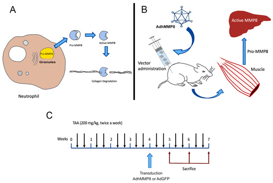 García-Bañuelos, J.; Oceguera-Contreras, E.; Sandoval-Rodríguez, A.; Bastidas-Ramírez, B.E.; Lucano-Landeros, S.; Gordillo-Bastidas, D.; Gómez-Meda, B.C.; Santos, A.; Cerda-Reyes, E.; Armendariz-Borunda, J. AdhMMP8 Vector Administration in Muscle: An Alternate Strategy to Regress Hepatic Fibrosis. Cells 2023, 12, 2127. https://doi.org/10.3390/cells12172127