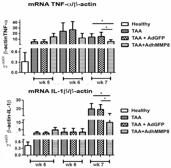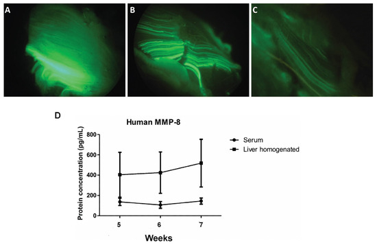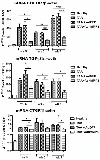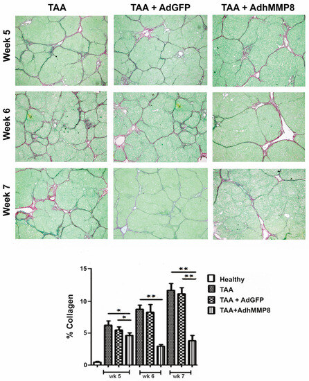 - Siller-López, F.; Sandoval, A.; Salgado, S.; Salazar, A.; Bueno, M.; Garcia, J.; Vera, J.; Gálvez, J.; Hernández, I.; Ramos, M. Treatment with human metalloproteinase-8 gene delivery ameliorates experimental rat liver cirrhosis. Gastroenterology 2004, 126, 1122–1133; discussion 949. [Google Scholar] [CrossRef]
