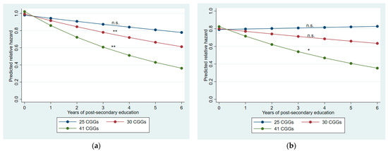 Estimated hazard ratios by education and CGG repeats: (a) from Model 2 (with IQ and 1957 family SES controlled); (b) from Model 6 (with all intervening factors controlled). Note: n.s. not significant, * p < 0.05, ** p < 0.01.