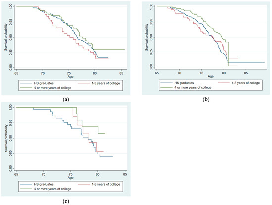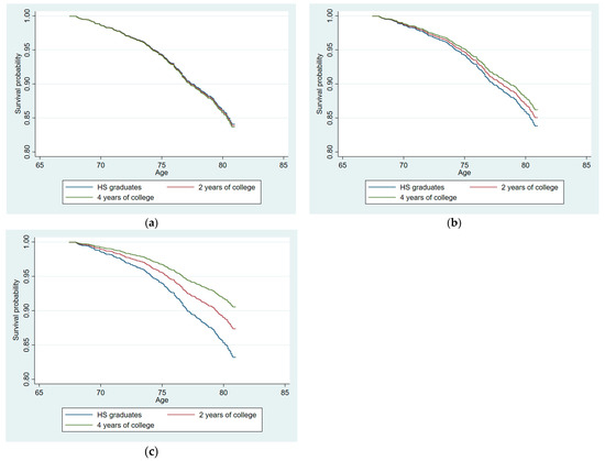 Estimated survival functions by education and CGG repeats (with all intervening factors controlled): (a) estimated at 25 CGG repeats; (b) estimated at 30 CGG repeats; (c) estimated at 41 CGG repeats.