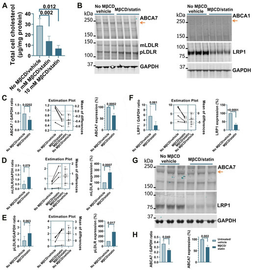 Reduced ABCA7 protein levels after cholesterol depletion in human C20 and HMC3 microglia cells. (A) C20 cells treated with the indicated concentrations of MβCD for 45 min and then kept in 5 μM rosuvastatin without FBS for 24 h had significantly lower cholesterol concentrations. The 10 mM MβCD/5 μM rosuvastatin treatment significantly reduced the levels of ABCA7 (B,C) and LRP1 (B,F), and significantly increased the levels of mLDLR (B,D) and pLDLR (B,E). (B) ABCA1 expression was at the limit of detection before and after the treatment. (G,H) HMC3 cells depleted in cholesterol using the 10 mM MβCD/5 μM rosuvastatin treatment had significantly lower levels of ABCA7 and LRP1 protein. Statistical analysis in (A)—ordinary ANOVA; (C–F)—paired t-test for the ratio values (the experiments are numbered in the estimation plots, n = 4) and unpaired t-test for the changes in the protein expression on the percentage basis with the average value in the controls set at 100%; (H)—t-test.