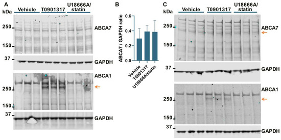 The LXR agonist T0901317 and U18666A/statin co-treatment did not affect the ABCA7 protein in human microglia cells. (A,B) The experiment with C20 cells was repeated four times, and the results were analyzed using repeated measures ANOVA without finding any significant difference (F = 1.85, p = 0.26). (C) T0901317 and the U18666A/statin co-treatment did not affect ABCA7 in HMC3 cells. As expected, T0901317 induced strong expression of ABCA1 in both cell types. The anti-ABCA1 antibody in one batch detected a spurious band at a higher molecular weight than ABCA1 ((A,C) and Figure 2A). The identity of the ABCA1 protein band was confirmed using BHK-ABCA1 cells. Subsequent batches of this same anti-ABCA1 antibody did not recognize the spurious band.