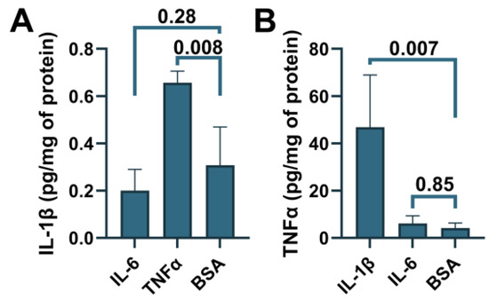 Induction of IL-1β secretion by TNFα and TNFα secretion by IL-1β in C20 cells. C20 cells were treated with the indicated cytokines, and then IL-1β (A) or TNFα (B) was measured in the cell medium using ELISA. Statistical analysis—ordinary ANOVA (n = 3).
