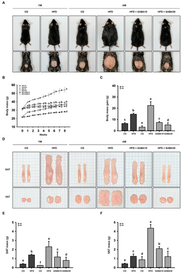 Effects of GABA on obesity in aged HFD-fed mice. (A) Representative images of mice. (B) Body mass during 8 weeks of GABA treatment. (C) Body mass gain after 8 weeks of GABA treatment. (D) Representative images of SAT and WAT. The scale of one grid is 1 mm. (E) SAT mass and (F) VAT mass after 8 weeks of GABA treatment. Values with different letters are significantly different: p < 0.05 (a > b > c > d > e > f).