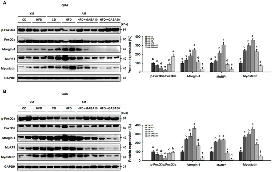 Effects of GABA on skeletal muscle atrophy in the skeletal muscle of aged HFD-fed mice. (A) Western blots of the atrophic proteins p-FoxO3a, FoxO3a, Atrogin-1, MuRF1, and Myostatin in the QUA. (B) Western blots of atrophic proteins in the GAS. Values with different letters are significantly different: p < 0.05 (a > b > c > d > e > f).