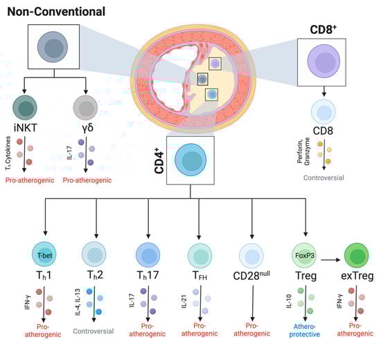 Role of T cell subsets in atherosclerosis. Lesional T cells can be broken up into three groups including T cells with α and β chains within their T cell receptor (TCR) like CD4+ T cells (middle) and CD8+ T cells (right) as well as non-conventional T cells that follow different activation pathways (left). Non-conventional T cells include the pro-atherogenic invariant natural killer T (iNKT) cells that express various T helper (Th) cytokines as well as interleukin (IL)-17 expressing γδ T cells. CD4+ T cells include Th subsets such as pro-atherogenic Th1 that express interferon-γ, controversial Th2 that expresses IL-4 and IL-13, and Th17 that expresses IL-17. Follicular T helper (TFH) cells as well as CD28null T cells are both CD4+, which are pro-atherogenic. Additionally, regulatory T (Treg) are atheroprotective CD4+ T cells; however, in late stage atherosclerosis, they convert to pro-atherogenic ex-Tregs. Finally, CD8+ T cells can infiltrate atherosclerotic plaques as well, but their role remains unclear. Created with biorender.com.
