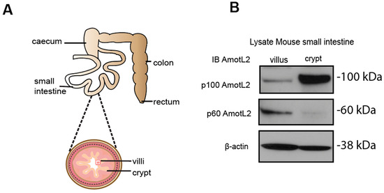 Mouse small intestine samples were fixed in 4% paraformaldehyde (PFA; product number sc-281692, Santa Cruz Biotechnology, Santa Cruz, CA, USA) in 1×PBS and embedded into a cryomold. Tissues were then cut into 10-μm sections and mounted onto glass slides. The slides were rinsed once in 1×PBS, permeabilized with 0.5% TritonX-100 (product number X100, Sigma-Aldrich, St. Louis, MO, USA) for 15 min, and non-specific staining was blocked with 0.5% horse serum diluted in 1×PBS. The slides were incubated with primary antibodies overnight at 4 °C, washed 3 times for 10 min in 1×PBS, and positive signals were detected with a secondary antibody at room temperature for 1 h. The slides were washed 3 times for 10 min in 1×PBS and mounted with DAPI-containing mounting media (product number F6182, Sigma-Aldrich, St. Louis, MO, USA). Immunohistochemistry of AmotL2 in human tissues was performed in collaboration with http://www.proteinatlas.org (accessed on 15 January 2021). The antibodies were generated in the Holmgren lab, and the results have not yet been made publicly available.