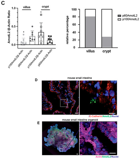 Given the localization of AmotL2 to areas of cell shedding in both normal and tumor tissues, we hypothesized that p60AmotL2 could be involved in the process of apical extrusion. We, therefore, analyzed whether p60AmotL2 was expressed in areas characterized by high turnover of cells and apical extrusion, such as the small intestine of the mouse. In the small intestine, proliferation is active in the stem cells localized to crypts. Epithelial cells migrate from a basal to an apical position and are eventually shed at the tip of the intestinal villi [28]. We mechanically separated the base of the villi (including the crypts) from the tip areas and analyzed the lysates by western blot (Figure 2A,B). Our data indicated that p60AmotL2 was primarily expressed in the villus fraction with lower expression in the crypt fraction. Conversely, p100AmotL2 was predominantly expressed in the crypt fraction (Figure 2B). Quantification of individual AmotL2 isoform expression and the relative expression of the two isoforms are shown in the bar diagrams in (Figure 2C). In addition, immunofluorescent staining of AmotL2 expression in the mouse small intestine showed a distinct signal in cells that were shed into the lumen (Figure 2D). A similar pattern was also observed in organoids derived from the mouse small intestine (Figure 2E).