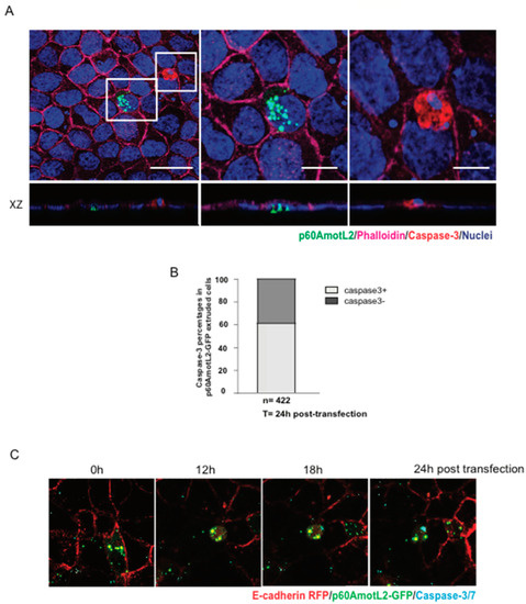 Considering that apoptotic cells may initiate signals leading to apical extrusion, we investigated whether p60AmotL2-triggered apoptosis could explain our observations. We assessed the effect of p60AmotL2 expression on cell viability using several approaches. First, a clonogenicity assay measuring the ability of single cells to proliferate and form colonies showed no negative impact of p60AmotL2 expression on colony formation (Supplementary Figure S1A,B). Secondly, the majority of extruding p60AmotL2-positive cells did not exhibit caspase-3 activation (Figure 5A,B). Additionally, live imaging demonstrated that p60AmotL2 expression and apical extrusion preceded caspase-3 activation (Figure 5C and Supplementary Movie S4). Collectively, our findings suggest that p60AmotL2 does not activate a pro-apoptotic program or adversely affect cell viability, strengthening the causal link between p60AmotL2 expression and apical extrusion.