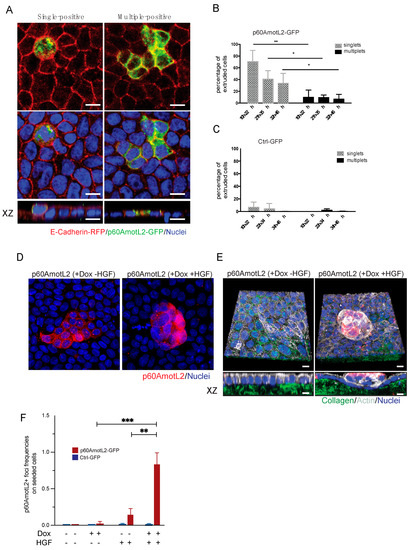 p60AmotL2 expression bypasses contact inhibition. (A) Immunofluorescence imaging displays the extrusion of a single p60AmotL2-GFP positive cell (left panel), while clusters of positive cells remain embedded in the epithelial layer (right panel). (B,C) Bar diagrams illustrate the quantification of extrusion percentages of single or multiple p60AmotL2-GFP or GFP-control cells (Mann–Whitney U-test, ** p < 0.01, * p < 0.05). (D) Dox-regulated p60AmotL2 cells were plated at a 1:50 ratio with wild-type MDCK cells on Collagen 1 matrix. Stimulation with HGF induced loss of contact inhibition and focus formation. (E) 3-D rendering of cells shown in D. Collagen was labeled with Oregon Green and actin visualized with phalloidin (shown in white) (F) Graph displaying the number of p60-positive foci formed after Dox and HGF stimulation as indicated (Mann–Whitney U-test, *** p < 0.001, ** p < 0.01). Scale bar = 10 µm.