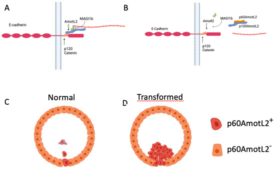 Hypothetical Model of p60AmotL2 in Normal and Pathological Extrusion. (A) AmotL2 p100 Interaction with E-Cadherin and Actin Filament Formation: AmotL2 p100 associates with E-cadherin through interaction with p120 Catenin, triggering actin filament formation. (B) Dominant-Negative Effect of p60AmotL2: p60AmotL2 functions as a dominant-negative factor, inhibiting the connection between p100AmotL2 and the E-cadherin junctional complex, as well as impeding actin filament formation. (C) Single Cell Expression of p60AmotL2: Cells expressing p60AmotL2 undergo extrusion and subsequently undergo anoikis. (D) Immortalized Cells Expressing p60AmotL2: Immortalized cells expressing p60AmotL2 evade anoikis, leading to sustained proliferation within the glandular lumen.