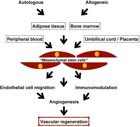 Mononuclear cells (MNCs), mesenchymal stem/stromal cells (MSCs), or marker-specific subsets of autologous or allogeneic harvested cells with angiogenic properties are examined as potential treatments for PAD patients [9,10,11,12]. MNCs were isolated from bone marrow (BM) or peripheral blood (PB), whereas MSCs can be isolated from a plethora of sources, including bone marrow, peripheral blood, umbilical cord, dental pulp, adipose tissue, and other tissues. Due to the progeniture properties and low immunogenicity of MSCs, as well as technological advancements in harvesting, isolating, and expanding MSCs, these cells are studied for vascular-related medical treatments. The purpose of this review is to discuss the use of MSCs for therapeutic angiogenesis in vascular research and medicine.