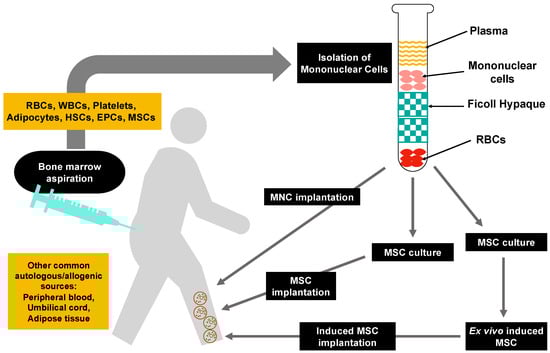 As one of the most encouraging cell types as a regenerative alternative to conventional interventions, MSCs for therapeutic angiogenesis are investigated as a viable option to overcome the problem of a large amount of BM required for extraction of adequate cells for a therapeutic number of BM-MNCs. Although BM-MNCs have been shown to provide therapeutic benefits in the treatment of CLI, some patients were of an advanced age and had severe complications, such as myocardial ischemia, heart failure, cerebrovascular disease, and renal failure [54,55].