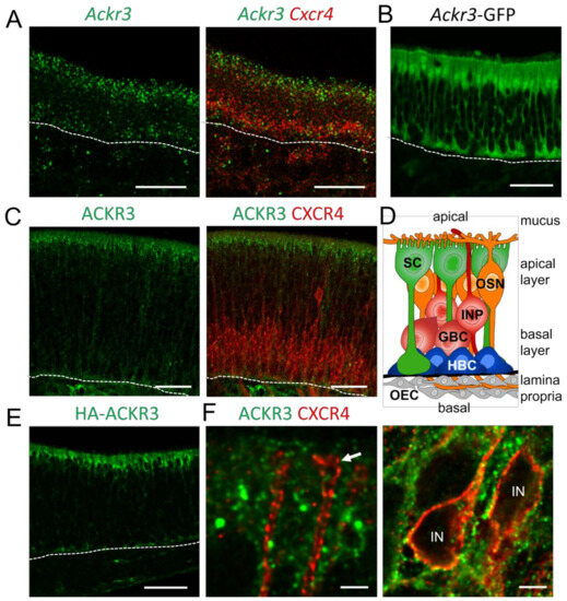 The following supporting information can be downloaded at: https://www.mdpi.com/article/10.3390/cells12172164/s1, Figure S1: Generation of Ackr3 knock-out in sustentacular cells of the OE, Figure S2: Control of PLA experiments, Figure S3: Co-localization of CXCR4 with γ-tubulin, Figure S4: Control experiments for Figure 6, Figure S5: TdTomato immunofluorescence in WT and Krt14-Cre;R26CAG-LSL-tdT, Table S1: Primary Antibodies, Table S2: Secondary Antibodies, Table S3: List of genotypes used in this study.