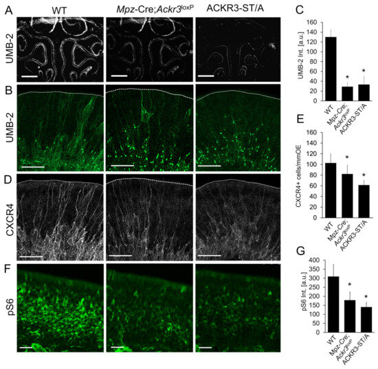Next, we investigated how CXCL12 scavenging by ACKR3 affects activation of CXCR4 and downstream signaling. CXCR4 activation can be detected with the anti-CXCR4 antibody UMB-2 which recognizes the C-terminal CXCR4 epitope only when the 346SSS348 cluster is not phosphorylated [55]. Since phosphorylation occurs upon receptor stimulation, the UMB-2 signal is lost in activated CXCR4. As expected, the overall UMB-2 signal was markedly reduced in Mpz-Cre;Ackr3LoxP/LoxP and ACKR3-ST/A mice, indicating massive phosphorylation and thereby activation of CXCR4 (Figure 3A). Higher magnification pictures moreover showed different distribution of non-phosphorylated CXCR4 (Figure 3B). In WT mice, non-phosphorylated CXCR4 was present on the plasma membrane and in intracellular clusters. In ACKR3-ST/A and Mpz-Cre;Ackr3LoxP/LoxP, non-phosphorylated receptors were no longer detectable on the cell surface, while the amount of intracellular clusters increased. Formation of CXCR4 clusters is known to be associated with exposure to high levels of CXCL12 [56,57]. Notably, CXCR4-positive spots were positioned close to the γ-tubulin-labeled microtubule-organizing center (MTOC) and were only found in post-mitotic neuronal progenitor cells, not in HBCs or dividing GBCs (Figure S3). In addition to the differences in protein localization, total amounts determined by staining intensities were altered in the same way (Figure 3C).