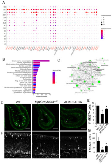 In order to further analyze the impact of deficient CXCL12 scavenging in the OE, we performed transcriptome analysis of mRNA from OE of P8 WT and Mpz-Cre;Ackr3LoxP/LoxP mice. To identify the genes specifically regulated in CXCR4-positive GBCs and INPs, we mapped the regulated genes to published single-cell sequencing data [46]. The mapping matched 56 of the downregulated genes to GBCs and INPs (Figure 4A), while only two of the upregulated genes were found in these cell types (Larp4, Uchl5). GO analysis of the differentially expressed genes revealed that genes involved in cell proliferation or cell cycle progression were enriched (Figure 4B,C). Moreover, network analysis demonstrated that most identified GO terms are strongly connected (Figure 4C). Among the downregulated genes is MKI67, an essential component of the perichromosomal layer and a marker for the condensed chromosomes in mitotic cells. Staining of proliferating cells in the OE with MKI67 antibodies confirmed this observation (Figure 4D,E), implying that the proliferation of CXCR4+ GBCs is inhibited by high CXCL12 levels in the microenvironment. Altered PI3K activity correlates well with altered cell proliferation. A reduction in cell proliferation was confirmed by analyzing the expression of MCM2 (Minichromosome Maintenance 2), a proliferation marker involved in the initiation of DNA replication (Figure 4F,G).