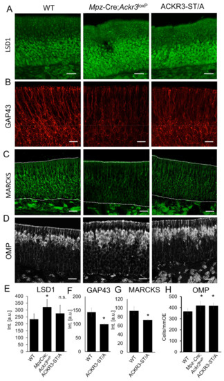 Another important aspect revealed by transcriptome analysis is that half (27 of 55) of the downregulated genes in GBCs of Mpz-Cre;Ackr3LoxP/LoxP mice are known to be involved in neurogenesis (marked red in Figure 4A). For example, downregulated Mad1l1 (mitotic arrest deficient 1 like 1) contributes to morphogenesis during brain development by regulating the integrity of the Golgi complex [60]. Interestingly, we detected an altered morphology of the Golgi apparatus in olfactory neurons of mice with deficient CXCL12 scavenging. We moreover found regulation of the REST corepressor 2 (Rcor2, also CoREST), which plays a key role in epigenetic regulation of cortical development [61]. Interestingly, of the 55 downregulated transcripts detected in the Mpz-Cre;Ackr3LoxP/LoxP OE, 13 (Hes6, Insm1, Rcor2, Ncapd2, Knch8, Gpc2, Cnpy, Sbk1, Hr, Fezf1, Thsd7b, Gng8, Robo3) were concordantly downregulated in neuronal progenitor cells of (embryonic) Nes-Cre;Rcor1LoxP/LoxP;Rcor2LoxP/LoxP mice [62]. Depletion of Rcor2 in neurogenic stem cells results in reduced proliferation and downregulation of MKI67 [61], also downregulated in the OE transcriptome of Mpz-Cre;Ackr3LoxP/LoxP mice (Figure 4). RCOR2 is well known to recruit the lysine-specific histone demethylase 1A (Kdm1a, also LSD1) to regulatory genomic regions, and LSD1 expression in GBCs and INPs plays a role for maturation of OSNs [63,64]. Immunofluorescence staining showed that Mpz-Cre;Ackr3LoxP/LoxP mice and ACKR3-ST/A mice showed increased staining of LSD1 (Figure 5A,E). We therefore analyzed markers of neuronal differentiation. Growth-associated protein 43 (GAP43), a marker for immature olfactory neurons and known to regulate neurite outgrowth [65], was localized on the plasma membrane and clustered in the cell bodies of numerous immature neurons present in P8 animals (Figure 5B). Mpz-Cre;Ackr3LoxP/LoxP and ACKR3-ST/A mice showed reduced labeling (Figure 5B). The high density impedes exact counting of immature neurons, but staining intensities in confocal pictures were significantly different for ACKR3-ST/A mice (Figure 5F). The structurally related Myristoylated Alanine-Rich C Kinase Substrate (MARCKS), also described as a marker of neuronal growth [66], showed similar alterations in staining intensities depending on CXCL12 availability (Figure 5C,G). The fact that the observed differences were very similar between Mpz-Cre;Ackr3LoxP/LoxP and ACKR3-ST/A mice most likely reflects altered CXCR4 signaling, caused by changes in the CXCL12 concentrations. Since both GAP43 and MARCKs are involved in dendrite growth, altered dendritic localization of both shows that CXCR4-CXCL12 signaling alters neuronal development. Due to an overall declining rate of neurogenesis during postnatal development, reduced numbers of GAP43-positive immature neurons were observed in 8W old WT animals (Figure S4C). However, also adult Mpz-Cre;Ackr3LoxP/LoxP animals showed a reduction in the number of GAP43-positive immature neurons compared to WT, similar to P8 animals.
