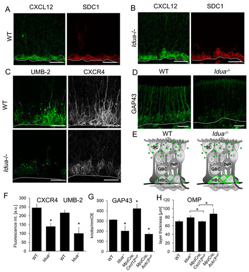 CXCL12 in HBCs is associated with HS. (A) Co-localization of CXCL12 (green) and SDC1 (red) in adult (8W) WT (A) and Idua−/− mice (B). (C) Immunostaining for the CXCL12 receptor CXCR4 (white) and UMB-2 (non-phosphorylated CXCR4, green) in the OE of WT mice and Idua−/− mice, showing that the amount of CXCR4 on the plasma membrane is reduced. (D) Immunofluorescence staining showing reduced number of GAP43-positive cells in Idua−/− mice. (E) Schematic overview of CXCL12 (green) localization in horizontal basal cells (HBC) of the OE of WT and Idua−/− mice. Quantification of immunofluorescence stainings showing (F) reduced number of CXCR4- and UMB-2 positive cells in Idua−/− mice, (G) reduced number of GAP43-positive immature neurons in Idua−/− mice, (H) number of OMP-positive OSNs in Idua−/−, Mpz-Cre;Ackr3LoxP/LoxP, and Mpz-Cre;Cxcl12LoxP/LoxP mice (n = 3 animals per group, Student’s t-test, error bars represent SEM, * p < 0.05). Scale bars (A,B): 20 μm, (C,D): 20 μm.