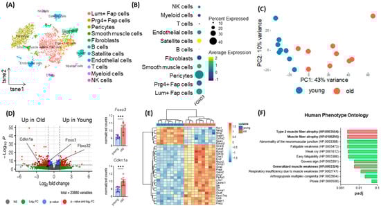Age-dependent upregulation of Foxo3 reflecting sarcopenia-related phenotypes. (A) TSNE plot displaying the different cell types in human M. vastus lateralis samples (n = 4, GSE130646) clustered by distinct expressional profiles. (B) Dot plot reflecting FOXO3 expression in eleven previously clustered cell types. Satellite cells show the highest Foxo3 expression. (C) PCA Plot reflecting the general expression pattern of young and old mice upon aging. (D) Volcano plot of (n = 17 mice) split into young (8 months, n = 8) and old (28 months, n = 9) individuals of M. gastrocnemius muscle displaying upregulation of Foxo3 expression in old mice (GSE145480). *** p < 0.001. (E) Heatmap displaying the 30 most differently expressed genes. (F) Gene ontology (Human Phenotype Ontology, EnrichR) reflecting upregulated genes associated with muscle atrophy diseases in humans (padj < 0.01).