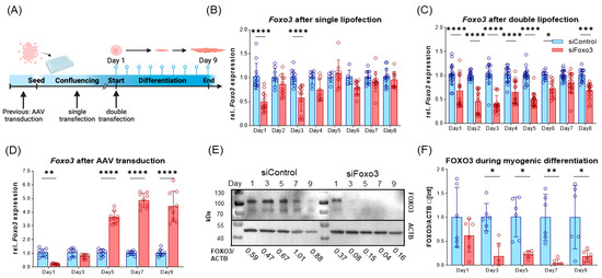 Since we hypothesize an upregulation of Foxo3 to be related to muscle disorders, we aimed for a technical Foxo3 knockdown. Due to the highest Foxo3 expression in satellite cells, C2C12 myoblasts were used. Originally, this cell line was derived from mice and exhibited behavior such as satellite cells [26]. We used different RNAi-based reagents, subdivided into pre- and parallel application, whereby only AAV-mediated plasmid delivery generated a long-term knockdown (Figure 2A). First, we transfected one siRNA against Foxo3 through single and double application via lipofectamine within one differentiation protocol, where we observed a short-term Foxo3 knockdown for single lipofection (up to 3 days, Figure 2B, Supplementary Figure S1) and double lipofection (knockdown up to Day 6, Figure 2C). In addition, we used AAV-mediated transduction to establish a more stable knockdown (Figure 2D–F). As expected, single lipofections only led to a significant Foxo3 knockdown on day 1 and day 3 (p < 0.0001) (Figure 2B). In comparison, double lipofection reached a successful Foxo3 knockdown until day 5 (p < 0.0001), day 6 (p < 0.05) and day 8 (p < 0.001), but with a trend of losing knockdown efficiency during differentiation (Figure 2C). Interestingly, we reached a knockdown efficiency of 80% for Foxo3 by AAV transduction (p < 0.01) on day 1, which turned out to not be significant on day 3 and even exceeded the control group from day 5 onwards (p<0.0001) on the transcriptional level (Figure 2D). However, on the protein level, the FOXO3 knockdown was successful and long-lasting from day 3 on (p < 0.05, p < 0.01) (Figure 2E,F).