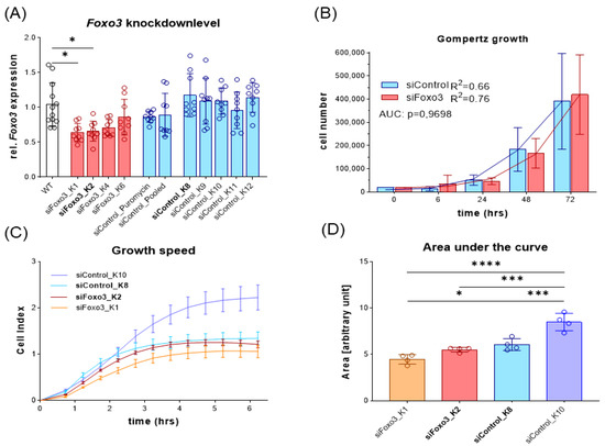For growth speed, cells were cultivated and harvested by trypsinization to quantify the cell number using Countess 3 FL (n = 4, Invitrogen, Thermo Fisher Scientific) at different time points. Subsequently, different monoclonal groups of Foxo3 knockdown (K1, K2, K4 and K6) and control (K8, K9, K10, K11 and K12) were pooled together to represent superior group differences. The growth behavior was approximated by the Gompertz growth model for group differences [18]. For individual consideration, cells were seeded on E-Plate 16 PET (Agilent Technologies, Santa Clara, CA, USA) using the xCELLigence RTCA DP system (Agilent Technologies) to detect the change in electrical resistance as cell index (n = 4). Analysis of the area under the curve (n = 4) revealed suitable cell lines that were used for further experiments.