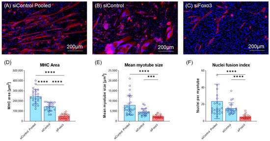 Next, cells were morphologically analyzed. Compared to the control group, a lower number of total myotubes and smaller myotubes were observed in the Foxo3 knockdown myotubes (Figure 4A–C, Supplementary Figure S2). Analysis of the MHC positive area revealed a smaller area in siFoxo3 compared to siControl pooled (p < 0.0001) and siControl (p < 0.0001) groups. But within the control groups, a significant (p < 0.0001) difference in the MHC positive area was found. Calculated mean myotube size revealed a decreased myotube size in siFoxo3 compared to siControl pooled (p < 0.0001) and siControl (p < 0.001). Calculated nuclei fusion indexes in both control groups indicated significantly less nuclei per myotube in siFoxo3 (p < 0.0001).