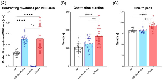 To test whether the morphological and transcriptional effects of a Foxo3 knockdown also effected the biomechanical properties of myotubes, an electrical stimulus was applied to the control group and Foxo3 knockdown myotubes to trigger contractions. The number of contracting myotubes was counted and normalized to the mean MHC area of each group. WT C2C12 were used as the positive control. The WT displayed lower contracting myotubes per MHC area compared to siControl pooled and siFoxo3 (p < 0.0001). Remarkably, no contractions were observed for siControl. SiControl pooled displayed no differences in contracting myotubes per MHC area compared to siFoxo3 (Figure 5A). The kinetic parameters time to peak and contraction duration revealed no differences between WT and siControl pooled, while siFoxo3 revealed a longer contraction duration as well as time to peak compared to WT (p < 0.0001) and siControl pooled (p < 0.01) (Figure 5B,C).