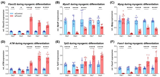 After the morphometric analysis, we characterized the differentiating myotubes on the molecular level. At first, we analyzed Fbxo32 as a direct target of FOXO3 [14], which had lower expression in siFoxo3 in earlier differentiation but displayed a higher expression in later differentiation (Figure 6A). Intriguingly, the Foxo3 knockdown led to lower levels of Myod1, which is an important factor for cell cycle exit in differentiation (Figure 6B) [27]. Moreover, another differentiation parameter was reduced within the same group: Myog, an important factor for myoblast fusion [28], was expressed significantly lower in siFoxo3 (p < 0.0001) from day 3 onwards (Figure 6C). We observed the activator of DNA damage response, ATM [29], to show higher expression in siFoxo3 from day 5 onwards (p < 0.0001) (Figure 6D). Furthermore, previous differentiation stages showed lower Tp53 expression until day 3 (p < 0.01) and higher expression from day 7 onwards (p < 0.0001) in Foxo3 knockdown myotubes (Figure 6E). The same dynamic expression was observed for Foxo1, another member of the same forkhead transcription factor family (Figure 6F) [12].