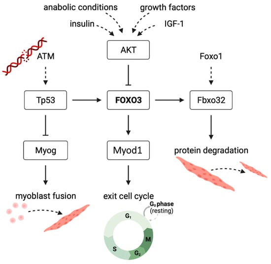 Suggested mechanism displaying the effect of Foxo3 gene knockdown on myogenic differentiation in C2C12 myotubes in vitro FOXO3-induced transcription of Fbxo32 to cause protein degradation. FOXO3 is further inhibited by the PI3K-AKT pathway in anabolic conditions. Knockdown of FOXO3 suppresses the expression of Myod1, an important player for the initiation of myogenic differentiation. Increased ATM levels are caused by DNA damage due to a lack of protective FOXO3. ATM expresses Tp53 to increase FOXO3, and it inhibits Myog that is needed for myoblast fusion to myotubes.