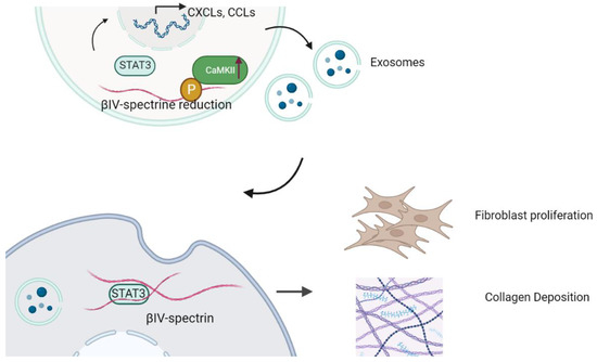 CaMKII’s pivotal role in regulating βIV-spectrin has been established, although its involvement in fibroblast communication remains unexplored. The same research group elucidated a signalosome framework facilitated by βIV-spectrin, which encompasses CaMKII and the transcriptional factor STAT3. CaMKII-dependent phosphorylation of βIV-spectrin leads to its degradation, triggering a disruption in STAT3-mediated gene transcription [8]. In a hypertrophy-induced heart failure (HF) model, disrupting the βIV-spectrin-CaMKII interaction prevents CaMKII-induced degradation of spectrin, safeguarding the heart against hypertrophy-induced cardiac fibrotic remodeling and dysfunction. Impaired STAT3 activity underlies the profibrotic gene transcription, cardiac fibrosis, and reduced cardiac function observed in mice with cardiac-specific βIV-spectrin knockout (βIV-cKO). The present study unveils a fresh role for βIV-spectrin-STAT3 in mediating exosomes and fibroblast communication. In pathological conditions such as HF, CaMKII activation can be instigated through profibrotic TGFβ signaling, potentially engaging in fibroblast–fibroblast communication through phosphorylation of βIV-spectrin (as depicted in Figure 1).