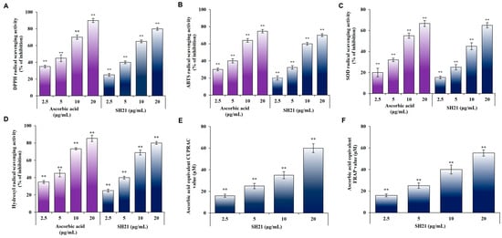 Antioxidant activity of protease SH21. The (A) DPPH assay, (B) ABTS assay, (C) Superoxide (SOD) radical scavenging assay, (D) Hydroxyl (HO) radical scavenging assay, (E) CUPRAC assay, and (F) FRAP assay were conducted with different concentrations of SH21, whereas ascorbic acid and gallic acid were used as standard antioxidant compounds. The reaction mixture without the sample was used as a negative control. All experiments were performed in triplicate. ** p < 0.01, significantly different from the control, using the student’s t-test.