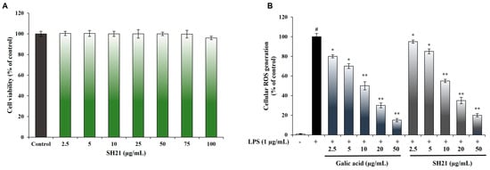 The toxic effects on RAW 264.7 cells with various concentrations (2.5 to 100 μg/mL) of SH21 were examined prior to investigating LPS-induced ROS scavenging activity. Reactive oxygen species (ROS) are dangerous to cellular function as they induce changes in nucleic acids, proteins, and lipids, ultimately leading to the development of inflammation, cancer, and neuron-related diseases []. The results showed that SH21 treatment inhibited ROS production in LPS-induced RAW 264.7 cells in a dose-dependent approach without showing cytotoxicity (Figure 3A,B).