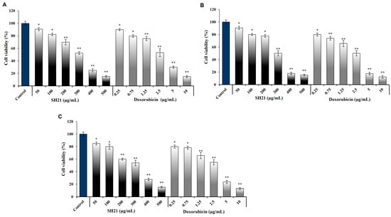 Anticancer activity of protease SH21 against three different cancer cell lines: (A) HL-60, (B) A549, and (C) Hela cells. Values were the means of triplicates (±) standard deviation (SD). Each experiment was perfomed three times (±) standard deviation. Significant differences were denoted as * p < 0.05 and ** p <0.01.