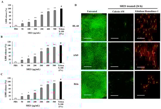 Membrane disruption ability of SH21 was assessed by observing LDH release and confocal microscopy assay. LDH leakage was monitored in three cancer cells, namely, (A) HL-60, (B) A549, and (C) Hela cells. All cancer cells were treated with different concentrations (50–500 μg/mL) of SH21, and absorbance were taken at 490 nm. PBS and Triton X-100 (1%, v/v) employed negative and positive controls, respectively. Values were the means of triplicates (±) standard deviation (SD). Significant differences were denoted as * p < 0.05 and ** p < 0.01. # p < 0.001. (D) Live/dead staining assay of SH21 against cancer cells (HL-60, A549, and Hela). Membrane damage was evaluated by employing confocal laser scanning microscopy (CLSM). All tested cancer cells were incubated with 500 μg/mL of SH21 for 24 h. Green fluorescence (Calcein-AM) and red fluorescence (Ethidium homodimer-1) indicated live and dead cells, respectively. Scale Bars = 100 µm.