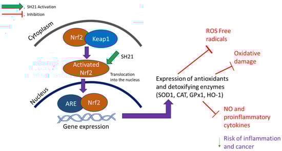 Oxidation and reactive oxygen species (ROS) are key contributors to the cancer signature, including angiogenesis, invasion, stem cell function, and metastases. Therefore, it has been shown that reduction in oxidation and ROS free radicals with potent antioxidants would be an effective strategy for the prevention of cancer. While antioxidant compounds are implicated in numerous molecular processes, the possible antioxidant mechanism of SH21 may be regulated by nuclear translocation of Nrf2 into the nucleus, which activates HO-1 expression (Figure 8). This subsequently causes expression of antioxidant enzymes that inhibit ROS free radicals, oxidative damage, and proinflammatory cytokine production, which helps to decrease the chance of inflammation-related diseases and cancers. Since oxidative stress and inflammation play important roles in a variety of degenerative diseases, preventing them is one of the most effective ways to prevent disease. SH21 has been shown to maintain cellular homeostasis and protect cells from oxidative stress and inflammation by significantly increasing both the mRNA and protein levels of antioxidant enzymes such as SOD1, CAT, and GPx-1 in RAW264.7 cells and inhibiting ROS generation and proinflammatory cytokines. Therefore, it is interesting that a novel biological agent, such as SH21, can treat several oxidative stress-related pathophysiological conditions. In addition, our study demonstrated that SH21 has direct anti-inflammatory and anticancer properties. As far we know, no other antioxidative protease has ever been reported that reveals prominent anti-inflammatory and anticancer activity that was isolated and purified from the Korean fermented food, kimchi.