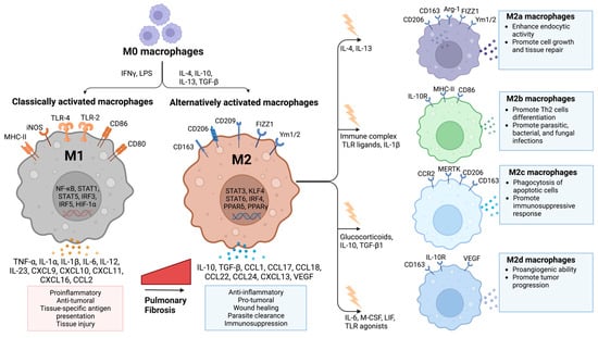 Macrophage polarization. Classically activated macrophages (M1) are generally considered to be pro-inflammatory/anti-fibrotic, and alternatively activated macrophages (M2) are generally anti-inflammatory/pro-fibrotic. M2 macrophages are further classified as M2a, M2b, M2c, and M2d subtypes. Created with BioRender.com (accessed on 27 August 2023).