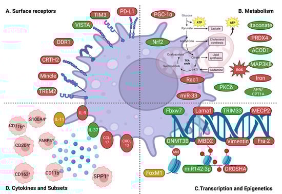 Schematic representation of macrophage-related mechanisms in IPF. Injurious and pro-fibrotic factors are shown in red. Protective /anti-fibrotic factors are shown in green. (A) Surface receptor-dependent mechanisms—Above-shown receptors were found to be upregulated in macrophages and implicated in lung fibrosis. (B) Metabolism-related mechanisms—Illustrating various fibrosis-related metabolites and metabolic regulators in macrophages. (C) Transcriptional and epigenetic mechanisms—Illustrating various transcriptional regulators and epigenetic modifications related to macrophages in lung fibrosis. (D) Subsets and macrophage-derived cytokines—Illustrating different cytokines and distinct subsets of lung macrophages in lung fibrosis. Created with BioRender.com (accessed on 27 August 2023).