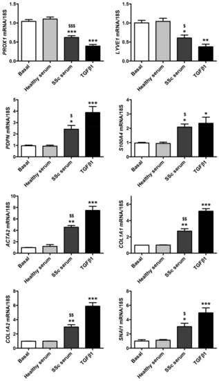 As shown in Figure 3, quantitative real-time PCR revealed a significant decrease in the mRNA levels of PROX1 and LYVE1 lymphatic endothelial-specific genes in HdLy-MVECs treated for 48 h with serum from SSc patients or TGFβ1. This was paralleled by a significant induction of the gene expression of PDPN (i.e., gene coding for podoplanin), S100A4, ACTA2 (i.e., gene coding for α-SMA), COL1A1 (i.e., gene coding for α-1 chain of type I collagen), COL1A2 (i.e., gene coding for α-2 chain of type I collagen), and SNAI1 (i.e., gene coding for the transcription factor Snail1). Conversely, the treatment with serum from healthy individuals did not change the expression levels of either lymphatic endothelial or myofibroblast genes (Figure 3).