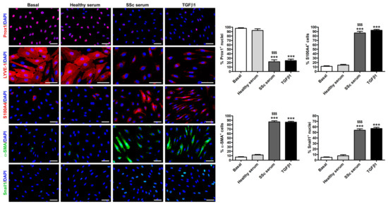 Treatment with serum from SSc patients leads to the acquisition of myofibroblast-like morphological features in healthy dermal lymphatic microvascular endothelial cells (HdLy-MVECs). The representative phase-contrast microphotographs of HdLy-MVECs (n = 3 cell lines) at basal condition and after 72 h culture with serum from healthy controls (n = 6), serum from SSc patients (n = 6), or recombinant human TGFβ1 are shown in the upper panels. Scale bar = 400 μm. The representative fluorescence microphotographs of HdLy-MVECs at the same experimental conditions and stained for filamentous actin (F-actin) with Alexa 488-conjugated phalloidin (green) are shown in the middle panels. The nuclei are stained blue with 4′,6-diamidino-2-phenylindole (DAPI). Scale bar = 50 μm. When compared to the basal condition, HdLy-MVEC morphology does not change in cultures challenged with serum from healthy donors. Upon treatment with SSc serum or TGFβ1, HdLy-MVECs lose their characteristic polygonal cobblestone-like morphology and exhibit an elongated spindle-shaped morphology. Bars in the lower panels represent the mean ± SEM of the percentage of cells with an elongated spindle-shaped morphology (left) or cells with stress fibers (right) per high-power field (40× original magnification). One-way ANOVA with post hoc Tukey’s test was used for statistical analysis. *** p < 0.001 vs. basal condition; $$$ p < 0.001 vs. healthy serum. TGFβ1: transforming growth factor-β1; SSc: systemic sclerosis.