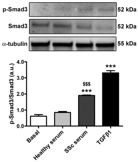 Finally, we investigated whether treatment with SSc serum could activate Smad-dependent canonical TGFβ signaling in HdLy-MVECs. We first measured the levels of TGFβ1 by enzyme-linked immunosorbent assay in the SSc serum samples that were used to stimulate HdLy-MVECs in the in vitro assays, and found that they were significantly increased (mean ± SEM, 91.39 ± 17.32 pg/mL) compared to serum samples from healthy donors (mean ± SEM, 36.06 ± 10.28 pg/mL; p = 0.02). Indeed, the culture of HdLy-MVECs with SSc serum or recombinant human TGFβ1 resulted in a significant increase in the levels of phosphorylated-Smad3 compared to both cells treated with healthy serum and those cultured in basal medium (Figure 7).