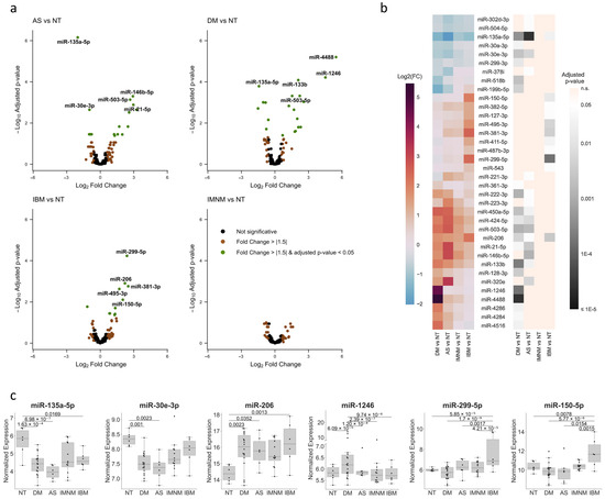 Expression profiles of differentially expressed miRNAs in each type of IIM. (a) Volcano plot representation of the differential expression analysis of each type of IIM (AS, DM, IBM, or IMNM) relative to histologically normal tissue (NT). Labels indicate the five differentially expressed miRNAs with the lowest p-adjusted value for each IIM type. (b) Heatmap representations including the fold change (left) and adjusted p-values (right) resulting from the differential expression analysis for each type of IIM relative to NT, selecting all the miRNAs identified as differentially expressed in at least one IIM type compared to NT. (c) Graphs represent log-scaled normalized expression levels of differentially expressed miRNAs that are representative of common IIM or IIM type-specific changes. The expression profile of the rest of the differentially expressed miRNAs identified can be found in Figure S2. Note that, for the miRNAs whose expression was exceptionally high in a few samples, the y-axis has been broken for a better representation of the expression in the rest of the samples.