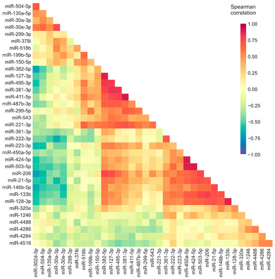 Correlation of the expression of differentially expressed miRNAs. Heatmap representation of the Spearman’s rank correlation coefficients between the expression levels of the miRNAs that were differentially expressed in one or more types of IIM muscle compared to histologically normal muscle.